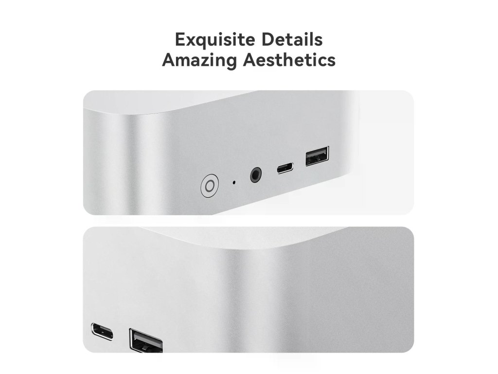 Die Größe dieses Mini-PCs beträgt 113 x 126 x 49 mm bei einem Gewicht von etwa 750 Gramm. Dieser Mini-PC ist kompakt und stilvoll. Egal, wo er platziert wird, er fügt sich immer harmonisch in das Design ein.