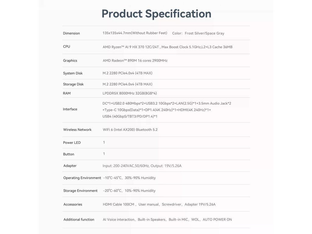 Die Größe dieses Mini-PCs beträgt 135 x 135 x 45 mm bei einem Gewicht von etwa 700 Gramm. Dieser Mini-PC ist kompakt und stilvoll. Egal, wo er platziert wird, er fügt sich immer harmonisch in das Design ein.