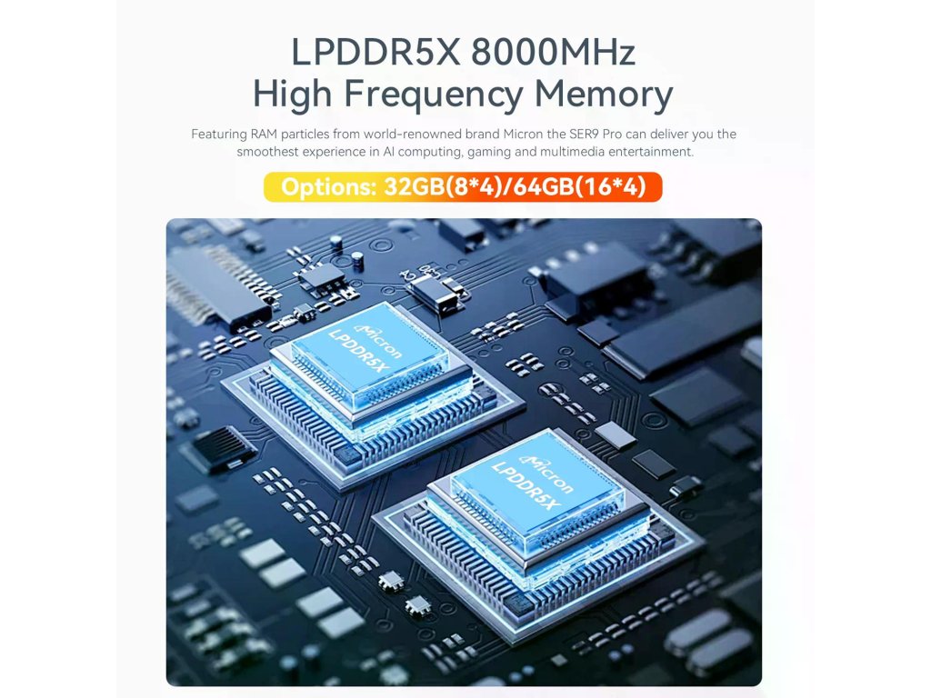 Das leistungsstärkste Modell der SER-Serie, das künstliche Intelligenz direkt auf dem Prozessorchip mit einer Neural Processing Unit unterstützt. Modell SER9 AI mit 32 GB LPDDR5X 7500 MHz Arbeitsspeicher, 1–5 TB M.2 SSD-Speicher, Prozessor AMD Ryzen 9 HX 370. Betriebssystem Windows 11 Pro.